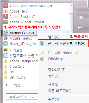 - 보안소프트웨어가 설치되지 않을 경우, 우측 그림안내처럼 인터넷 익스플로러를 관리자 권한으로 실행하시어 설치 하십시요.